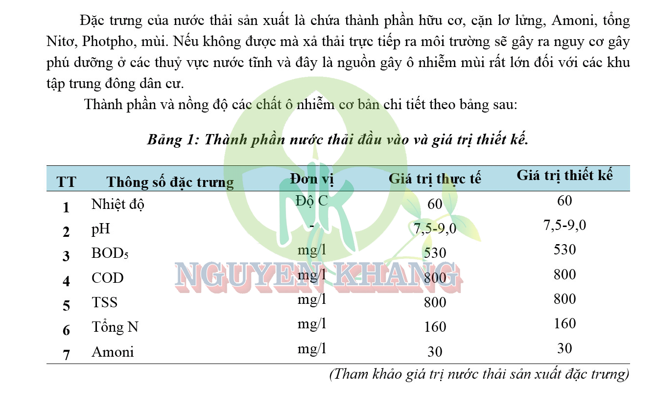 Nước thải cao su chứa nồng độ chất ô nhiễm cao được mô tả trong bảng dưới đây: