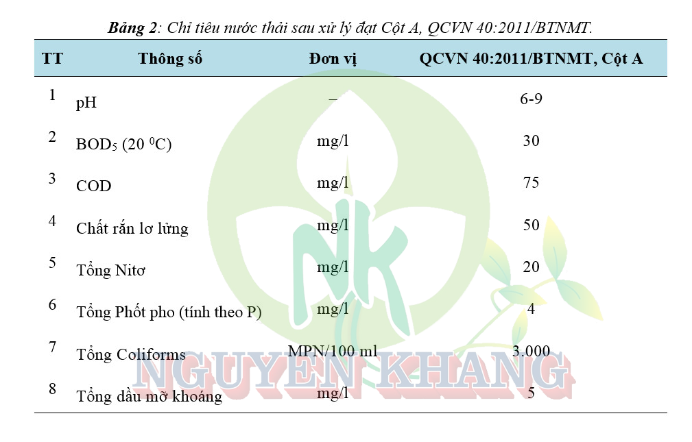 - Nước thải sau khi xử lý đạt tiêu chuẩn cột A, QCVN 40:2011/BTNMT.
